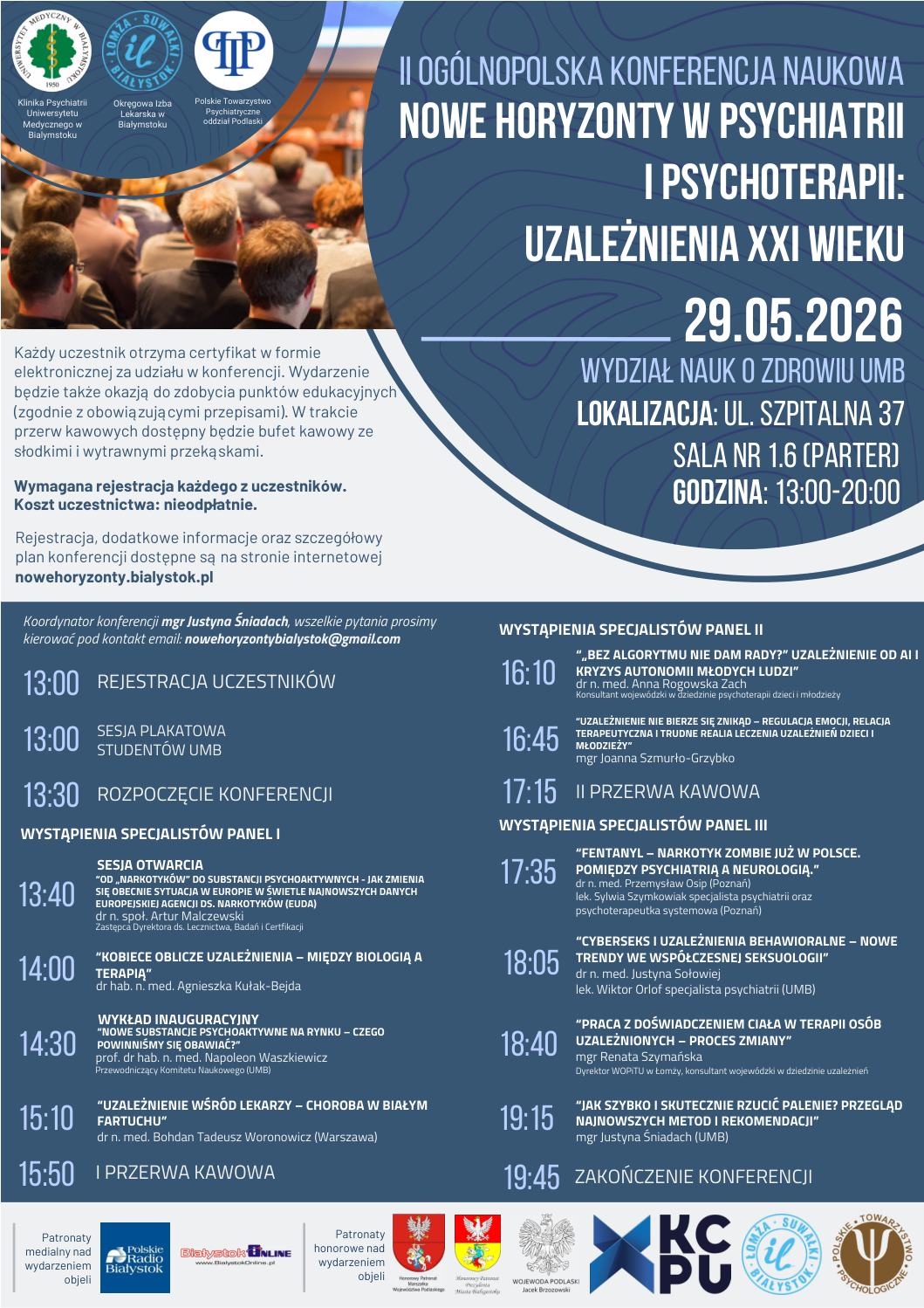 Konferencja organizowana przez Klinikę Psychiatrii Uniwersytetu Medycznego w Białymstoku, we współpracy z Podlaskim Oddziałem Polskiego Towarzystwa Psychiatrycznego oraz Okręgową Izbą Lekarską w Białymstoku, stanowi interdyscyplinarne forum wymiany wiedzy i doświadczeń w obszarze współczesnych uzależnień oraz ich konsekwencji klinicznych i społecznych.