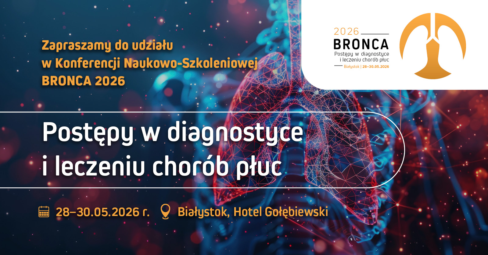 mamy ogromną przyjemność zaprosić Państwa do stolicy Podlasia na Konferencję Naukowo-Szkoleniową BRONCA 2026 „Postępy w diagnostyce i leczeniu chorób płuc”, która odbędzie się w dniach 28–30 maja 2026 r. w Hotelu Gołębiewski w Białymstoku. Jej celem jest przedstawienie najnowszych osiągnięć w diagnostyce i leczeniu chorób płuc, ze szczególnym uwzględnieniem zaawansowanej diagnostyki raka płuca, chorób obturacyjnych oraz wentylacji nieinwazyjnej.